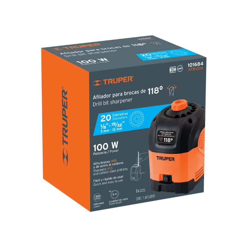 | Diámetros de afilado para brocas con punta 118° | 1/8", 9/64", 5/32", 11/64", 3/16", 13/64", 7/32", 15/64", 1/4", 17/64", 9/32", 19/64", 5/16", 21/64", 11/32", 23/64", 3/8", 7/16" y 1/2" |