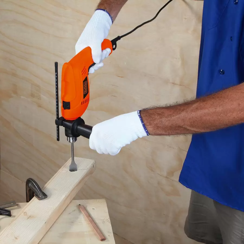 Selector de percusión o rotación. Broquero de 1/2 pulg (13 mm). Potente motor de 650 W. Barra de profundidad y empuñadura lateral multiposición. Interruptor de velocidad variable y reversa. Interruptor con bloqueo para uso continuo.