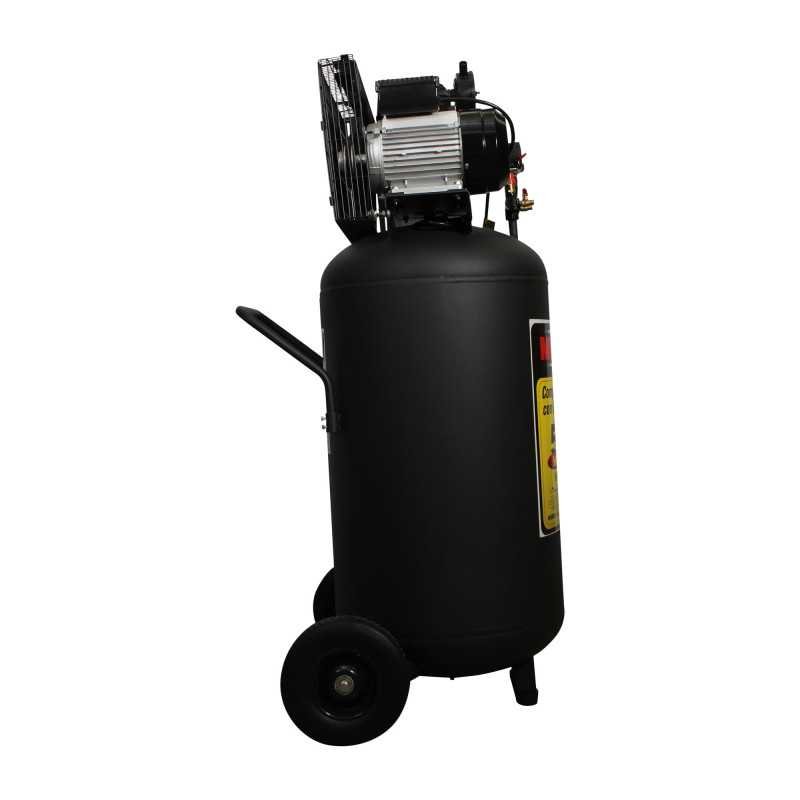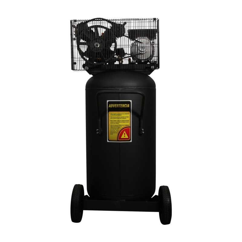 Este equipo está fabricado en acero reforzado con acabado en pintura electrostática para evitar la corrosión. Tiene ruedas para facilitar su transporte. Tiene un motor de inducción y cabezal de doble pistón conectados por un sistema de poleas y banda (incrementa su eficicencia y tiempo de vida). Su diseño vertical ahorra espacio en el taller. Cuenta con dos manómetros de presión, uno indica la presión dentro del tanque y el segundo indica la presión de salida, además de contar con válvula reguladora de presión.