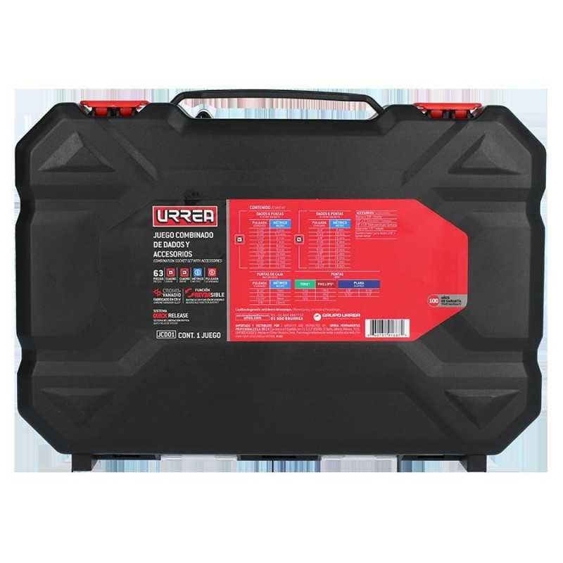 -Contenido: Dados 1/4": 5/32", 3/16", 7/32", 1/4", 9/32", 5/16", 11/32", 3/8", 7/16", 1/2", 5mm, 5.5mm, 6mm, 7mm, 8mm, 9mm, 1 mm, 11mm, 12mm, 13mm. Dados 3/8": 1/4",5/16",3/8",7/16",1/2",9/16",5/8",11/16",3/4",13/16", 8mm,10mm,11mm,12mm,13mm,14mm,15mm,16mm,17mm,18mm. Accesorios 3/8": Adaptador. Dado para bujía 5/8". Extensión 3". Matraca. Dados con punta: 9/32", 5/16", 11/32", 3/8", 7mm, 8mm, 9mm, 10mm. Destornillador magnética para puntas. Puntas: PH1, PH2, PH3, 1/8", 5/32", 3/16", 1/4", T10, T15, T20. Estuche que mantiene la herramienta ordenada.