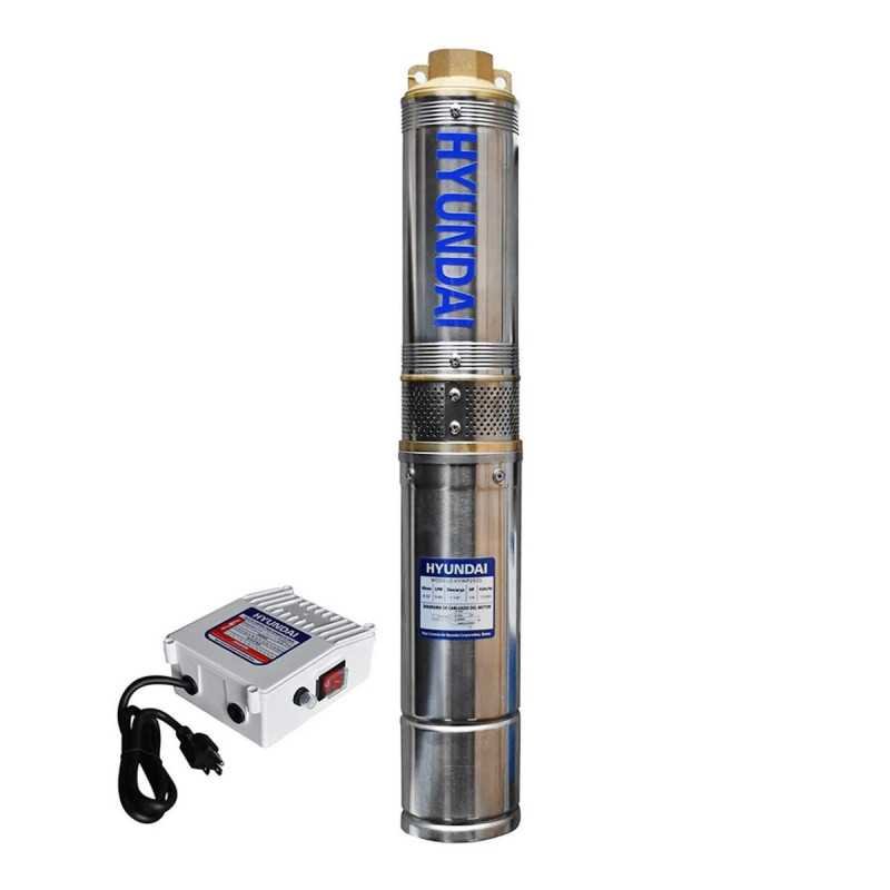 Motobomba sumergible con motor MONOFÁSICO e impulsor de Noryl marca HYUNDAI. Cuerpo de acero inoxidable. Ideales para pozos profundos de hasta un diámetro de 4" de agua limpia. Incluye caja de control.