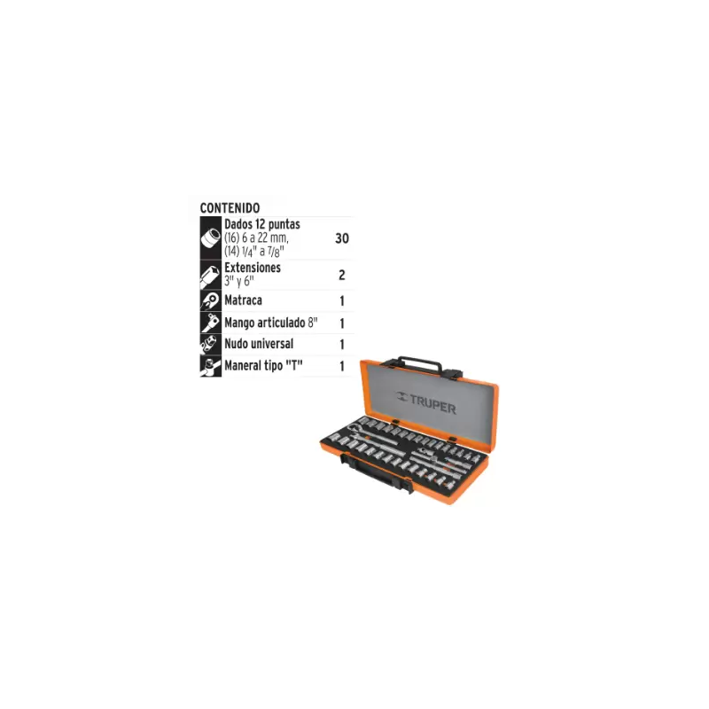 30 Dados 12 puntas: (16) 6 a 22 mm, (14) 1/4" a 7/8"