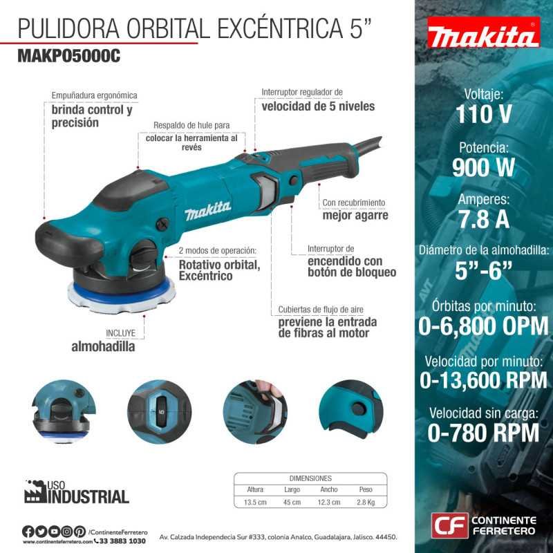El articulo se surte en caja de cartón e incluye 1 pulidora Makita modelo PO5000C, llave hexagonal y 1 almohadilla.