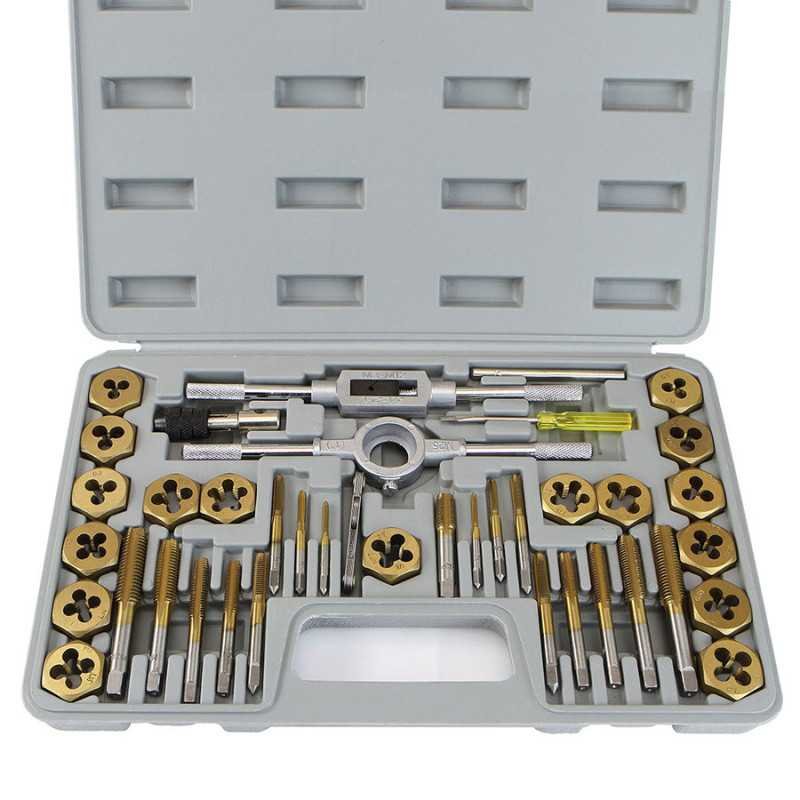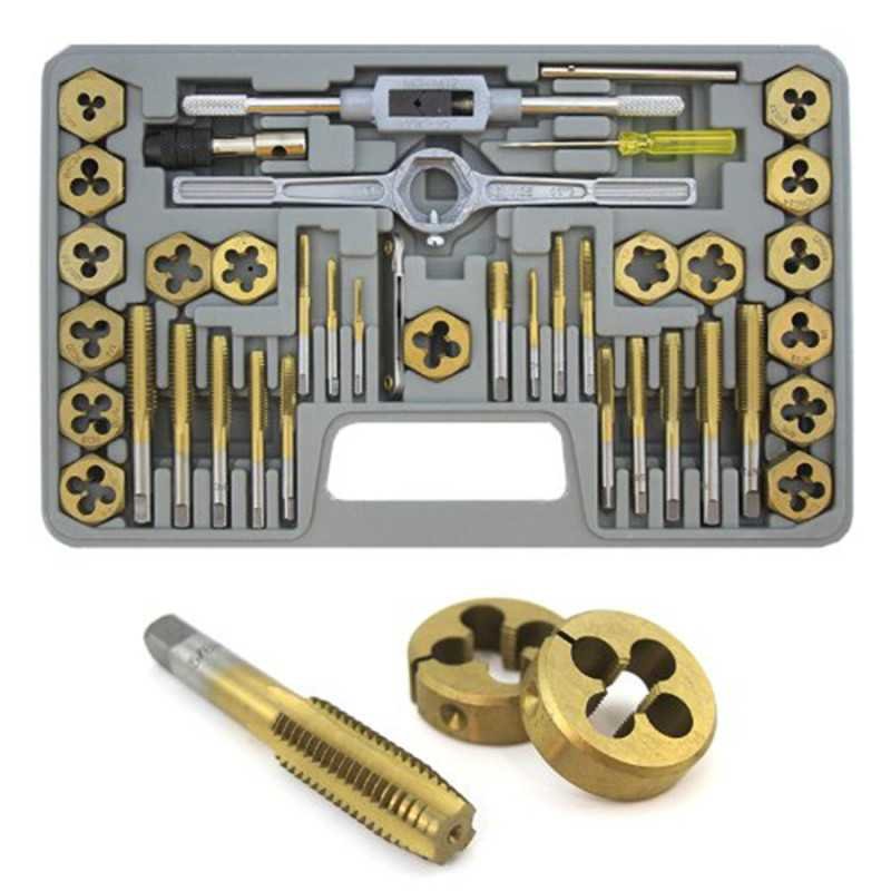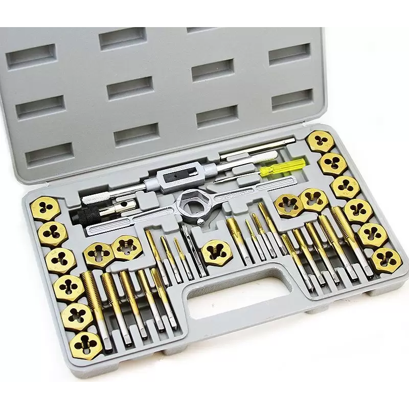 | CARACTERISTICAS | Recubierto de titanio Matriz de roscar y hexágono de 17 piezas: 4-40 unc, 6-32 unc, 8-32 unc, 10-24 unc, 10-32 unf, 12-24 unc, 1 / 4-20 unc, 1 / 4-28 unc , 5 / 16-18 unc, 5 / 16-24 UNC, 3 / 8-16 unc, 3 / 8-24 UNC, 7 / 16-14 unc, 7 / 16-20 UNC, 1 / 2-13 unc, 1 / 2-20 sin, 1/8 NPT 27 1 llave inglesa ajustable y llave inglesa con mango en "T" 1 llave inglesa ajustable 1 destornillador 1 calibre de tono Estuche de transporte ABS |