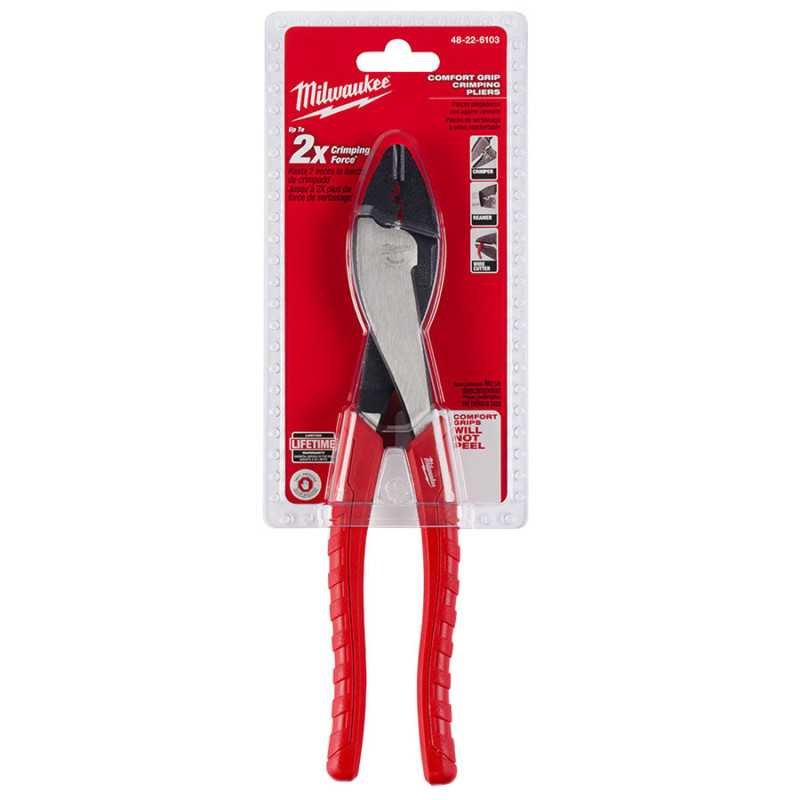 Las pinzas crimpeadoras de Milwaukee cuentan con mordazas endurecidas para ofrecer hasta el doble de fuerza de crimpeado para terminales aisladas y no aisladas. Un cabezal estriado integrado facilita alisar bordes irregulares de tuberías metálicas antes de la instalación. Las empuñaduras cómodas del mango de Milwaukee no se pelarán ni se enterrarán en las manos durante el uso prolongado.