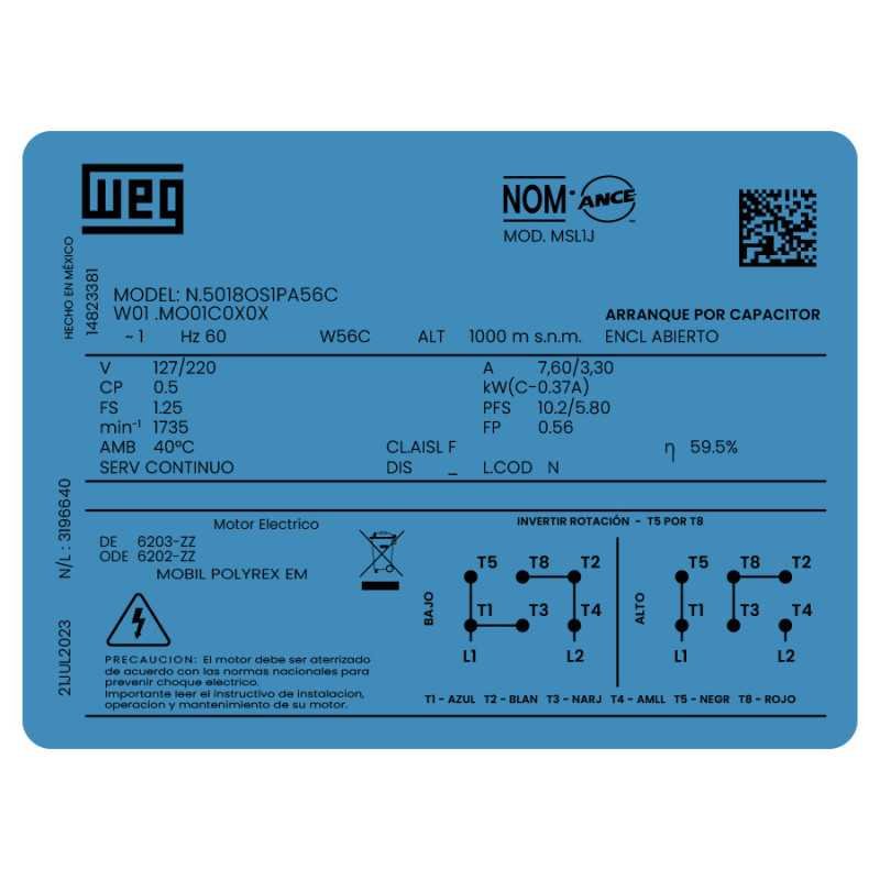 Motor monofásico WEG de 1/2 HP y 1750 rpm