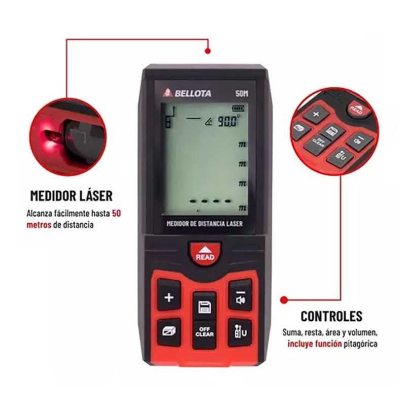 Distanciómetro láser con alcance de hasta 50 metros, obtén mejor reflexión en superficies con una precisión de +/- 2 mm y memoria interna de hasta 99 mediciones en metros, pulgadas y pies suma, resta y mide en grados de inclinación en segundos.