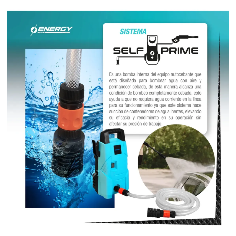 Su función autocebante permite utilizarla con agua de cubetas, tinacos o depósitos, sin necesidad de presión directa. Incluye cable de 5 metros y manguera de alta presión de 3 metros que brindan excelente alcance y movilidad.