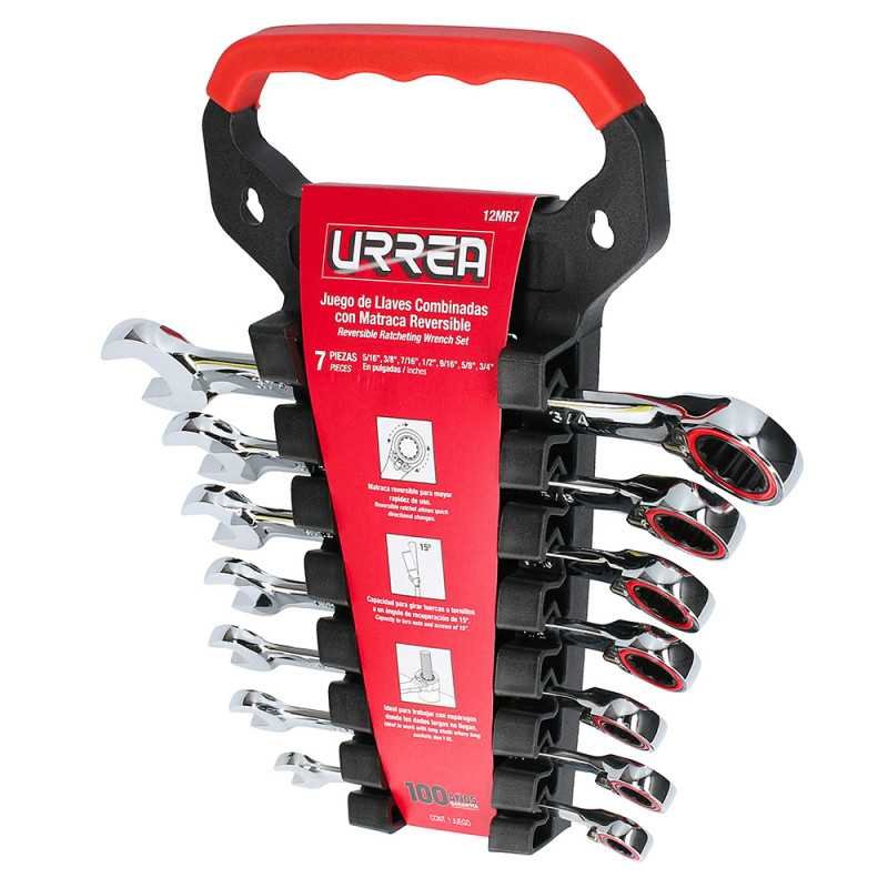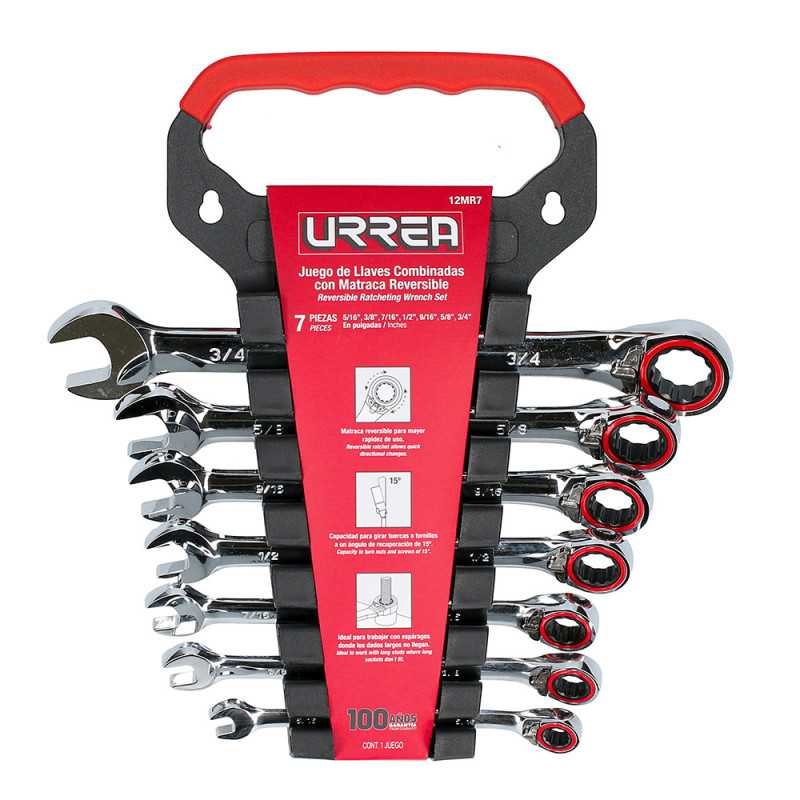 Juego de llaves combinadas pulido espejo de matraca rev en pulgadas 12 puntas 7 piezas Urrea 12MR7