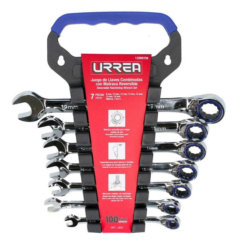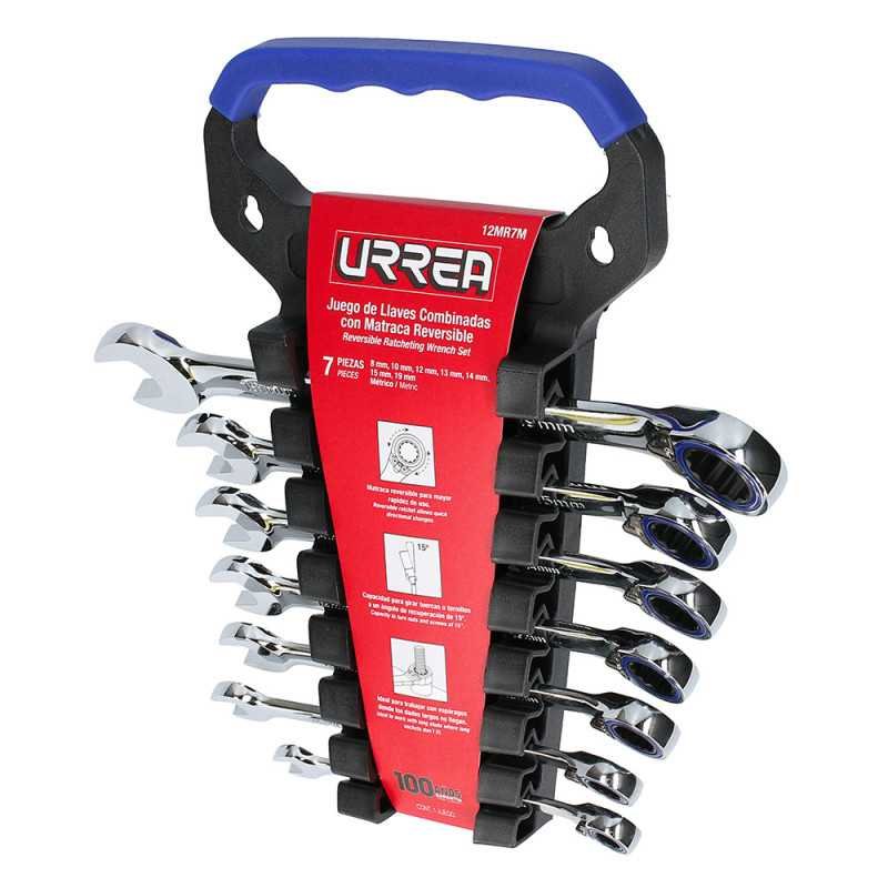Juego de llaves combinadas pulido espejo de matraca rev metricas 12 puntas 7 piezas Urrea 12MR7M