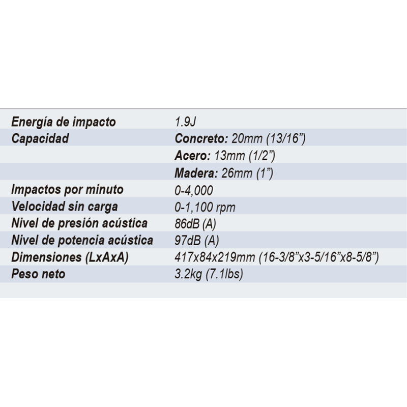 Envió a toda la repúblicaDHL, Estafeta, Fedex, Castores,Martillo Rotativo Combinado 15/16" v.v.r.0-950 rpm m/BL li-ion s/bat -carg c/freno-L/torq-maletin 18V Impactos por minuto: 0-4.700 Velocidad sin carga: 0-950rpm Nivel de vibración 13.5m/s2 Dimensiones (LxAxA): 328x85x213mm (12-7/8"x3-3/8"x8-3/8") Peso neto: 3.3kg (7.3lbs) Joules 2J DHR241 DC18SD BL1850B D45820