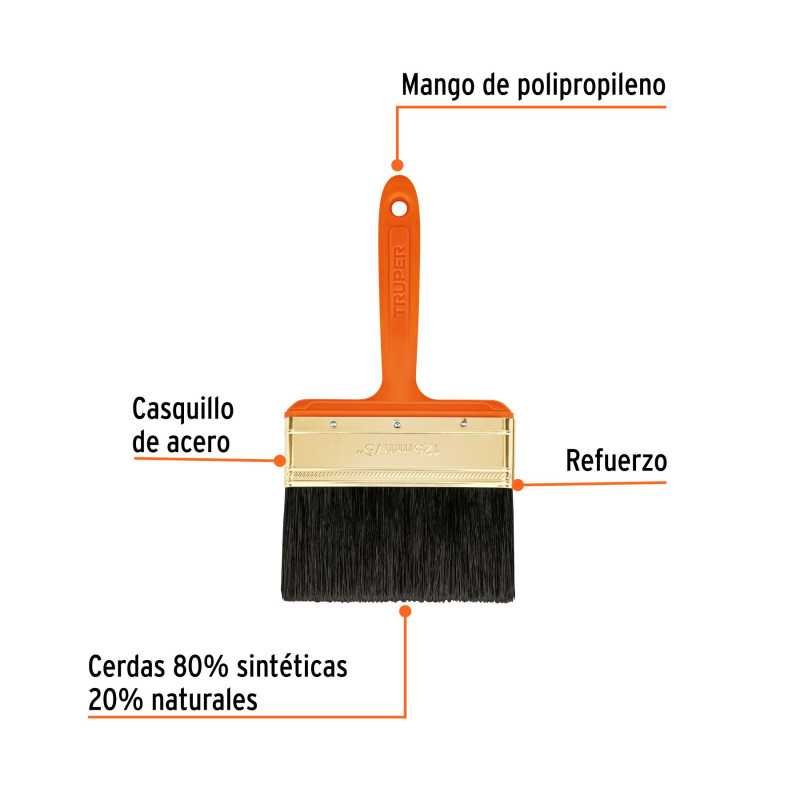 CÓDIGO: 14487 CLAVE: BRT-5 CARACTERÍSTICAS Cerda 100% natural, distribuye la pintura uniformemente y deja un acabado suave Resina epóxica que minimiza la caída de las cerdas Mango ligero de plástico para un trabajo más cómodo Mayor cantidad de cerdas que retienen más pintura para un mejor desempeño Orificio en el mango para colgar