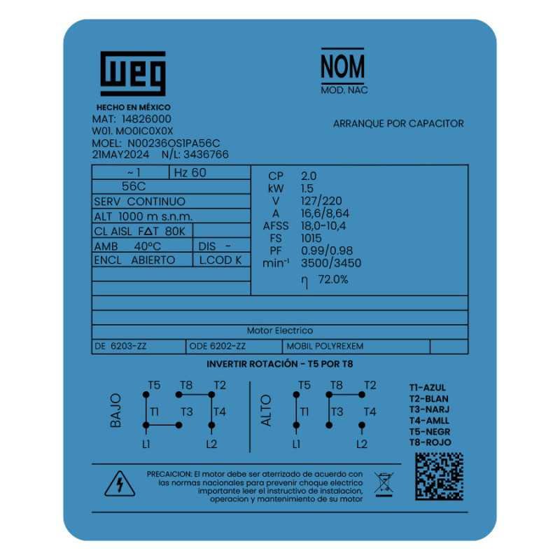Envió a toda la repúblicaDHL, Estafeta, Fedex, Castores,Use el motor en bombas, acondicionadores de aire, Compresores, Equipos de empaquetamiento y otros productos monofásicos. Motor Monofásico. Armazón de lámina rolada. Uso general y continuo. Arranque con 2 capacitores. Rotor tipo jaula de ardilla. Abierto sin ventilación (ODP). Protección térmica incluida.
