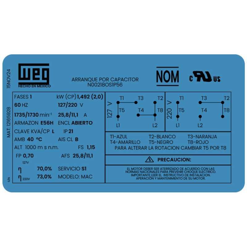Motor Monofasico 2 Hp 4 Polos Uso General Weg Weg0011-1