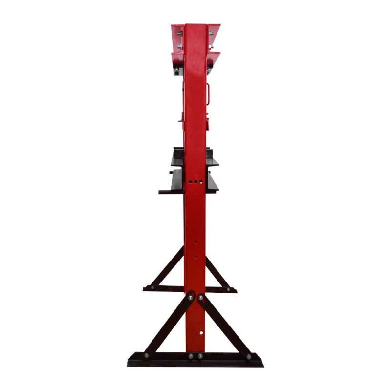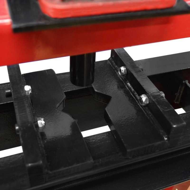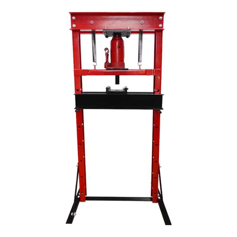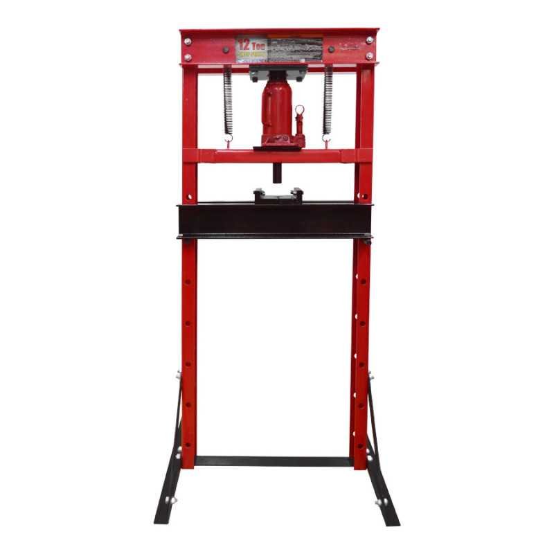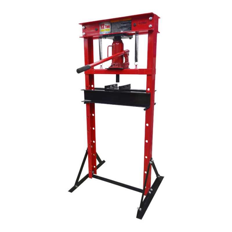 Características: Prensa hidráulica de accionamiento con palanca manual y retroceso por medio de resorte de tensión, base ajustable al suelo, rango de trabajo de 0 - 750 mm, capacidad de 12 toneladas.