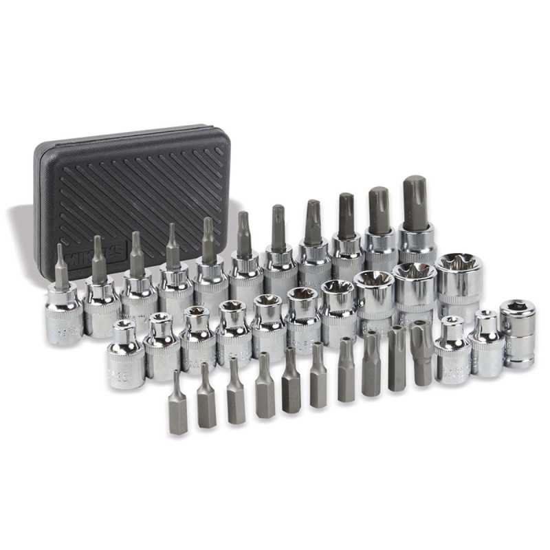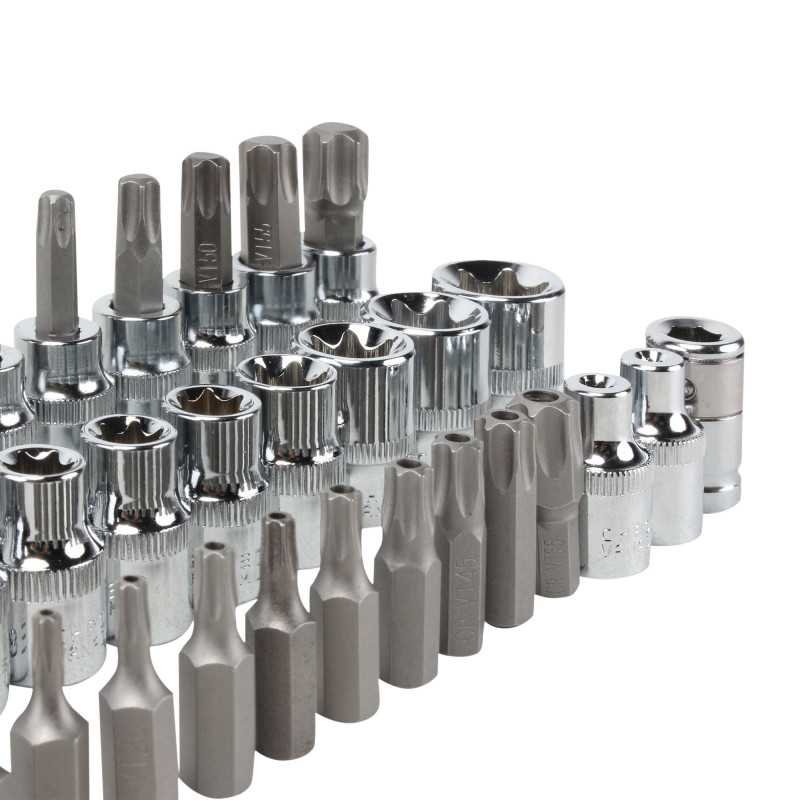 Este kit cuenta con 34 puntas forjadas en acero al cromo vanadio con acabado pulido natural. Acabado cromado para resistir la corrosión. Incluye: Estuche plástico
