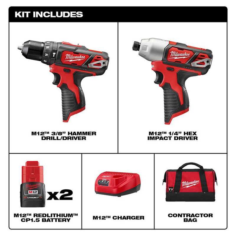 El combo de 2 herramientas inalámbricas 2497-22 M12 incluye un rotomartillo M12 de 3/8" es compacto y ligero, proporciona 275 pulg-lb de torque y 0-400/0-1500 RPM, su portabrocas de trinquete de mango simple de metal ofrece un mejor agarre de la broca y el indicador de carga y la luz LED le ofrecen mayor conveniencia y minimizan las interrupciones, mientras que la llave de impacto hexagonal de 1/4" M12 proporciona un rendimiento sin igual en un diseño ligero y portátil, su motor de alto rendimiento proporciona de 0 a 2500 RPM para una velocidad de aplicación superior.