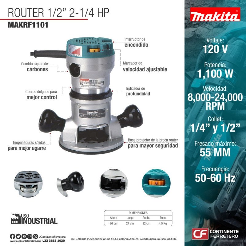 Poderoso router electrónico 1,100W para profesionales. Cuerpo delgado para un mejor control de la herramienta. Nivel de bajo ruido en su clase (s¢lo 81dB) para una operación confortable. Control de velocidad electrónica con arranque suave para un continuo acabado fino. Marcador de velocidad ajustable.