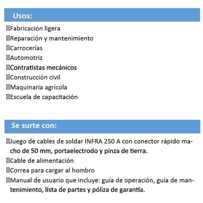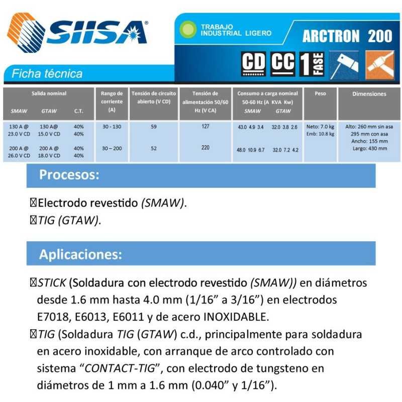 Procesos: ? Electrodo revestido (SMAW). ? TIG (GTAW). Aplicaciones: ? STICK (Soldadura con electrodo revestido (SMAW) en diámetros desde 1.6 mm hasta 4.0 mm (1/16 a 3/16) en electrodos E7018 E6013 E6011 y de acero INOXIDABLE. (Excepto electrodo revestido de aluminio). ? TIG (Soldadura TIG (GTAW) c.d. principalmente para soldadura de acero inoxidable con arranque de arco controlado con sistema CONTACT-TIG con electrodo de tungsteno en diámetros de 1 mm a 1.6 mm (0.040 y 1/16). Ventajas: ? Fuente de poder tipo inversor. ? Tensión de alimentación Dual 127 V c.a. / 220 V c.a. +/- 10 V % (de configuración automática según la tensión presente). ? Selector digital de proceso. ? Control electrónico de corriente que permite un ajuste preciso de la corriente de soldadura. ? Protección contra calentamiento excesivo que evita daños al equipo por abuso del ciclo de trabajo. ? Sistema de enfriamiento de ventilación forzada. ? Indicador luminoso de encendido. ? In