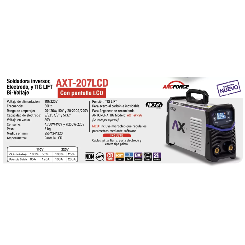Soldadora Inversor AxTech AXT-207LCD Soldadora Inversor Electrodo Y Tig Lift Bi-Voltaje AxTech Axt-207LCD
